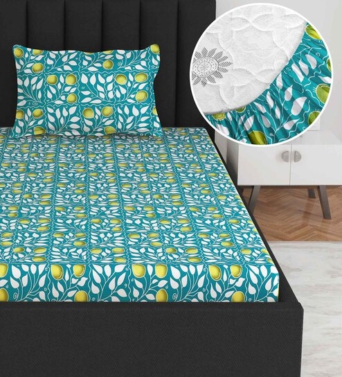 Green Floral 144 TC Cotton Single Fitted Bedsheet With 1 Pillow Cover