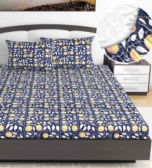 Blue Floral 144 TC Cotton King Fitted Bedsheet with 2 Pillow Covers