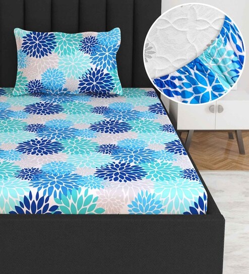 Blue Floral 144 TC Cotton Single Fitted Bedsheet With 1 Pillow Cover