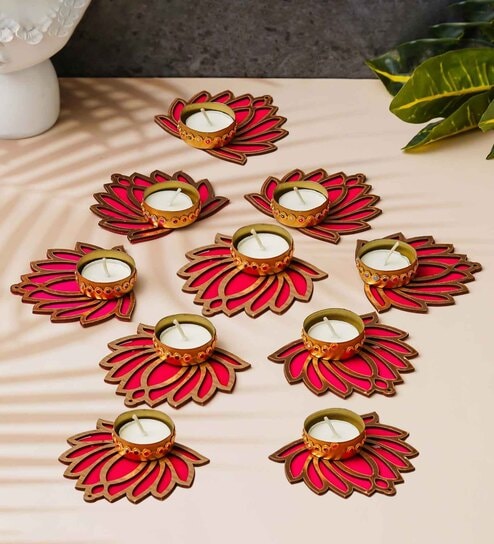 Maroon Wood Golden Pink Wooden Cut Out Lotus Flower Rangoli Tea Light Holders(Set of 5)
