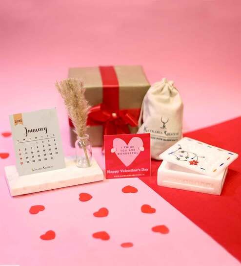 Valentines Day Gift with White Coasters Set & Desk Calendar 2025