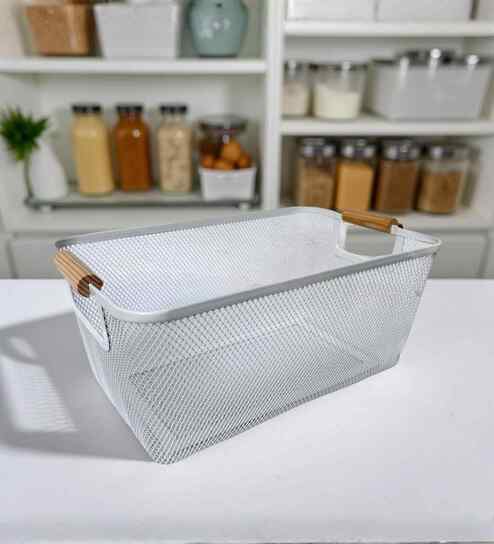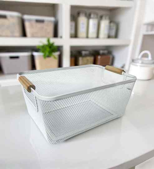 Ecru White Powder-Coated Metal Mesh Storage Basket
