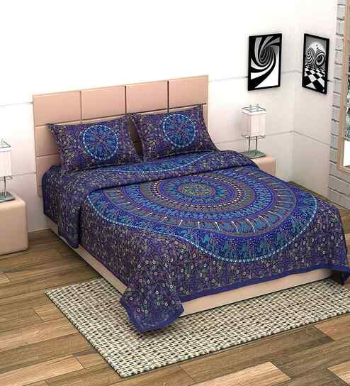 Blue Traditional 180 TC Cotton King Sized Bedsheet with 2 Pillow Covers