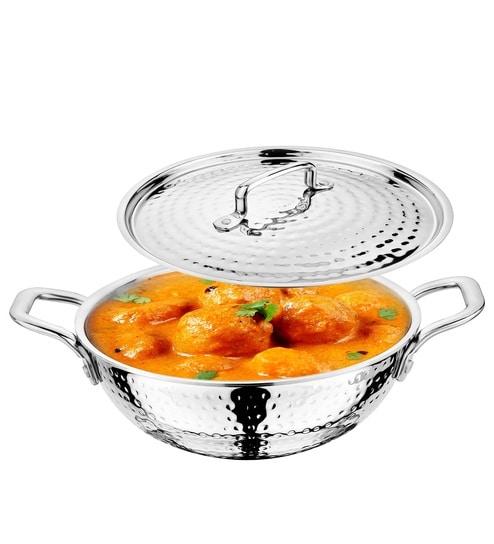 Silver Hammered Triply Stainless Steel 20 cm Deep Kadhai with Stainless Steel Lid