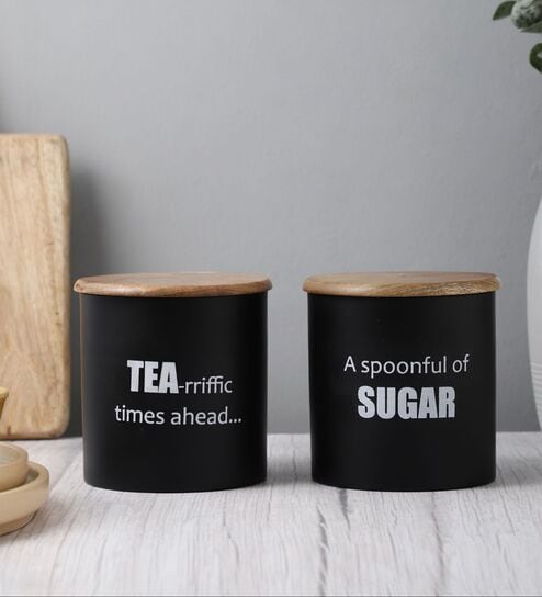 Ardura Black Metal Tea Sugar Containers with Wooden Lids Set of 2