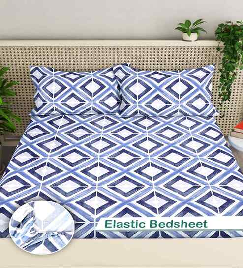 Blue Geometric 300 TC Cotton Blend King Size Fitted Double Bedsheet with 2 Pillow Covers