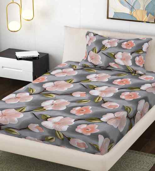 Grey Floral 144 TC Cotton Single Bed Sheet Bedsheet 1 Pillow Prime Collection