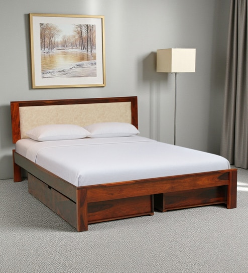 Brakel Sheesham Wood Queen Size Bed In Honey Oak Finish With Drawer Storage