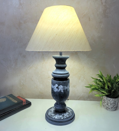 Grey Stone Finish Handpainted and hancarved Distress wooden Table lamp in Vaase handcarved design with handpainted fabric shade
