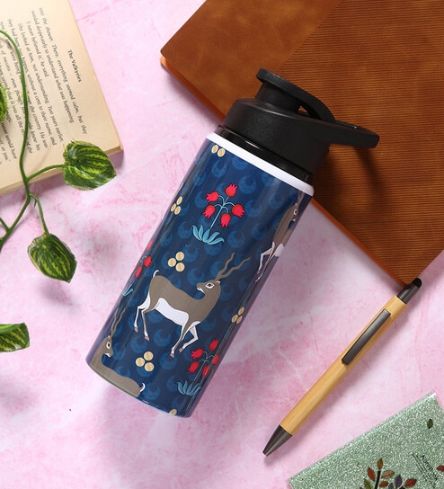 Aluminium Sipper Water Bottle With Navy Blue & Grey Deer Print 750Ml