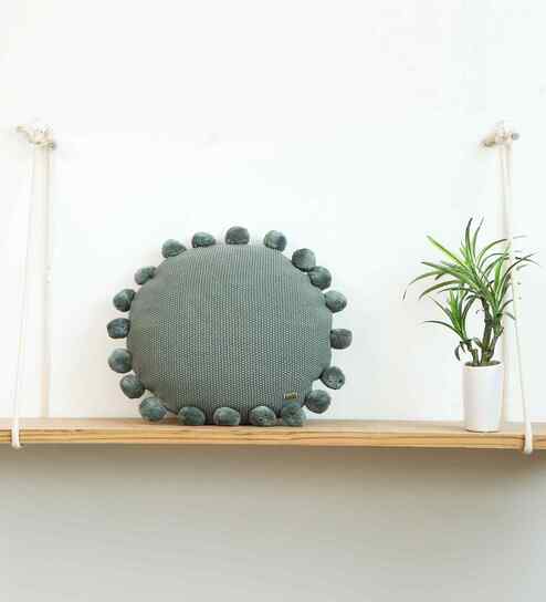 Ryegrass 100% Cotton Pom Pom 16X16 Inches Knitted Cushion Cover