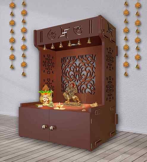 Elegant Wooden Floor Pooja Mandir with Laser-Cut Design with Storage Cabinet