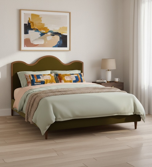 Solara Wave Luxe Queen Size Bed in velvet With Oak wood Frame & Hydraulic Storage