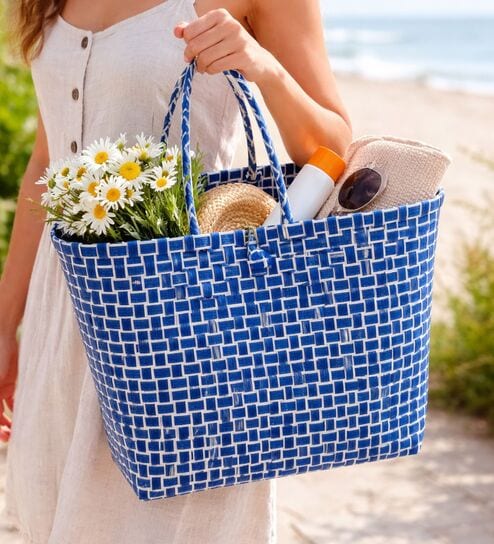 Steel Blue PU Leather and Natural Rattan Tissue Holder with Weighted Bar Design