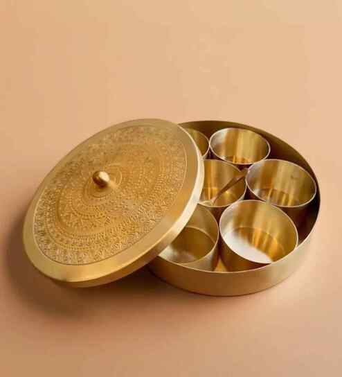 Golden Aura Kanjeevaram Inspired Pure Brass 7 Compartments Masala Traditional Spice Box