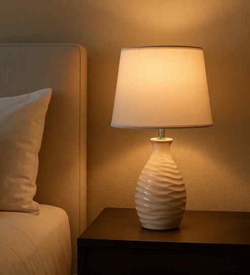 White Stone Finish Handpainted and hancarved Distress wooden Table lamp in Matka handcarved design with handpainted fabric shade
