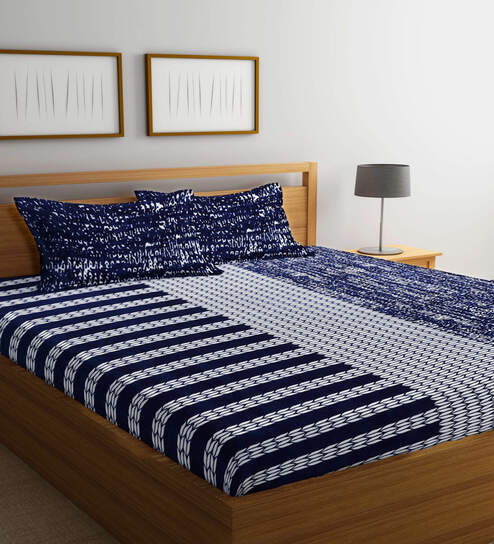 Blue Geometric 300 TC Woollen Fitted Double Bedsheet with 2 Pillow Covers