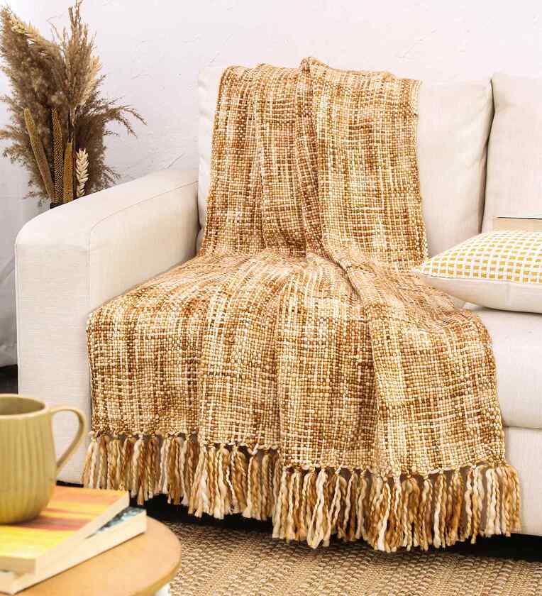 Drape this textured fringe throw over any solid, neutral coloured sofa with cushions that complement each other.
