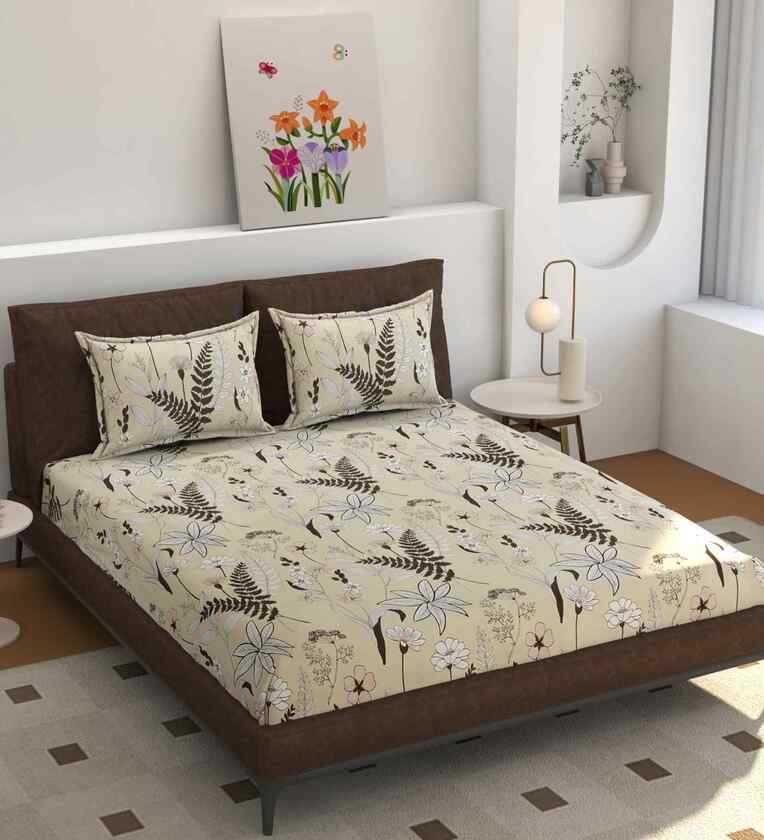 180 TC Microfiber Floral Double Bedsheet with 2 Pillow Covers (Cream, 245x228 CM)