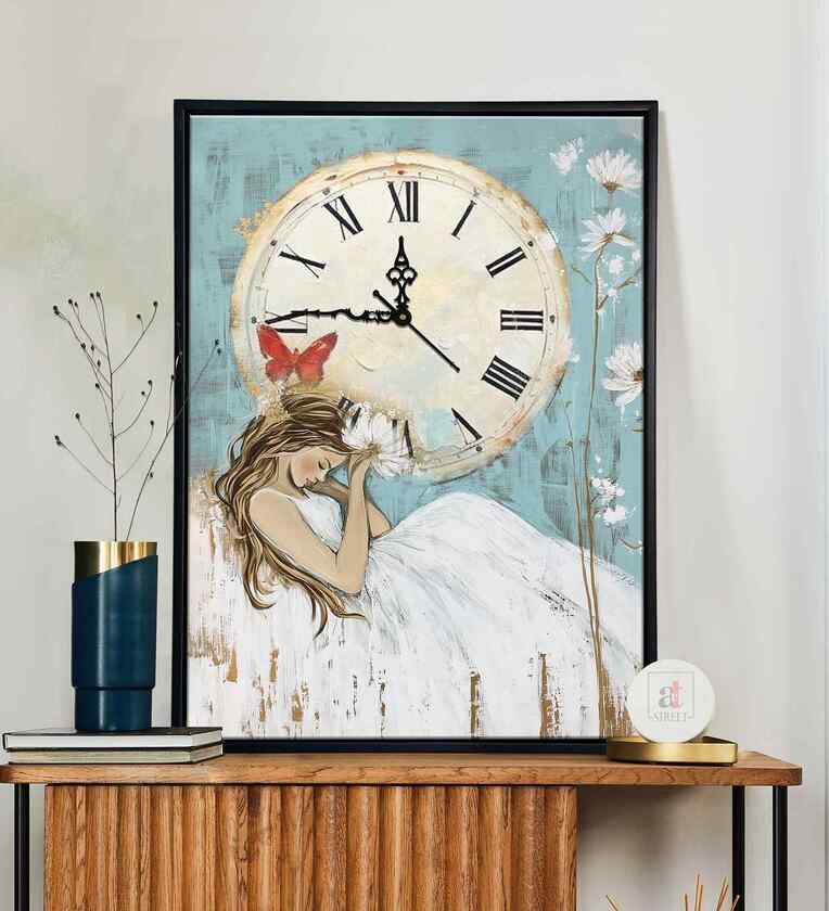 Add a touch of elegance and artistic charm to your living space with this Painting Mantra Portrait Abstract Wall Art featuring a dreamy multicolor depiction of a girl. Printed on high-quality stretched cotton canvas and framed with premium engineered wood, this beautiful piece also includes a durable inbuilt clock, making it both decorative and functional. Measuring 43 cm by 58 cm, it comes fully assembled with a strong MDF backing and pre-installed hook for easy hanging in your living room, bedroom, hallway, or office. Perfect for adding sophistication to your d cor or gifting to loved ones, this clock painting inspires positivity and creates lasting memories with its timeless appeal.