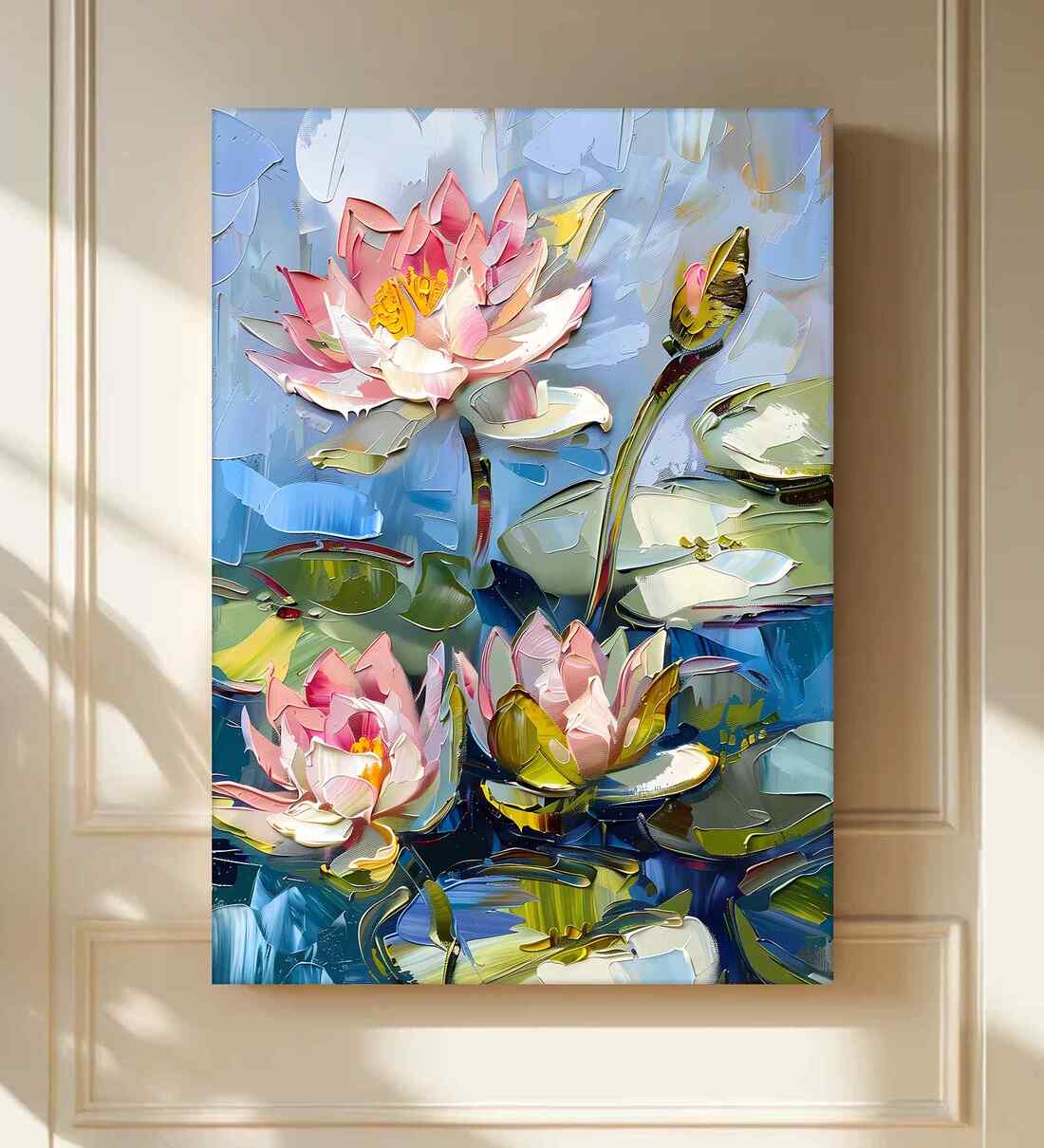 Experience tranquility and elegance with this beautiful digital painting on canvas, showcasing an abstract art rendition of a lotus flower on a pond. Featuring bold, prominent brushstrokes in soothing shades of pink, green, and sky blue, this artwork captures the serene beauty and spiritual symbolism of the lotus, a revered motif in Indian culture. Printed on high-quality canvas and stretched on durable wood (22x34 inches), it s perfect for adding a calming yet vibrant touch to your living room, meditation space, or office. Celebrate nature s purity and artistic expression with this exquisite piece that blends traditional significance with modern style.