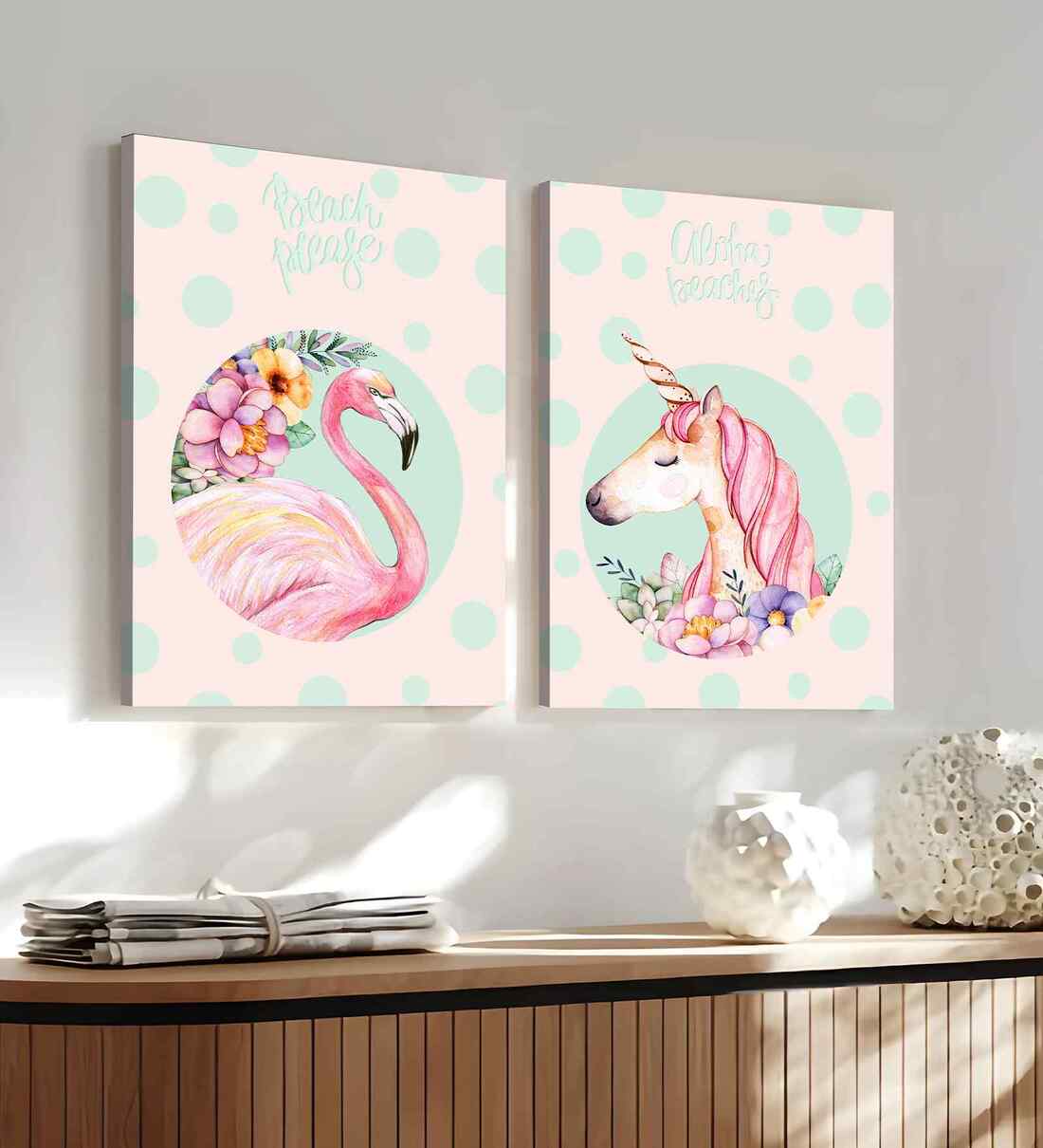 This Art Street Flamingo & Unicorn Theme stretched canvas art print pack of 2 is a playful and eye-catching digital artwork set that adds a dreamy and cheerful vibe to your space. Printed on premium stretched canvas in a 30x41 cm size, the combination of the elegant flamingo and magical unicorn brings a fun and imaginative touch. Perfect for Indian homes, kids' rooms, or creative spaces, it suits the living room, bedroom, hallways, or office, adding a colourful and lively charm to your d cor.