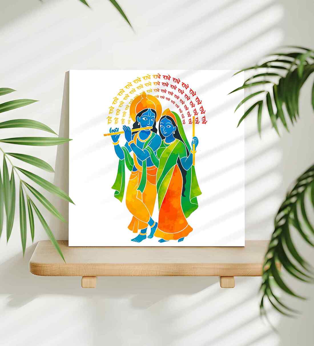 Bring home love and divinity with this Painting Mantra digital canvas wall art of Shree Radha Krishna, beautifully printed on 100% cotton canvas and neatly stretched on a strong wooden frame. Measuring 30x30 cm, this spiritual artwork comes ready to hang with a metallic hook attached at the back no setup needed, just unpack and hang. Perfect for your pooja room, temple wall, mandir corner, hallway, or as a decorative piece in your home or office. With its serene and devotional design, it also makes a thoughtful and meaningful gift for housewarming, weddings, anniversaries, festivals, or any special occasion.