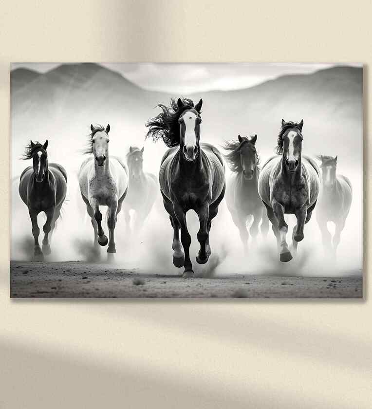 Feel the raw energy and freedom with this striking digital painting on canvas, inspired by photographic art capturing the movement and power of seven wild horses. Rendered in dramatic black and white, this artwork beautifully conveys strength, grace, and untamed spirit through dynamic brushstrokes and bold contrasts. Printed on premium canvas and stretched on sturdy wood (22x34 inches), it s a perfect statement piece for Indian homes, offices, or art lovers who appreciate powerful, monochrome aesthetics. Bring the wild essence of nature indoors with this captivating tribute to freedom and motion.
