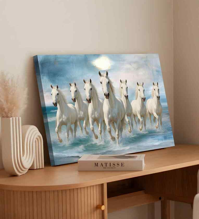 Bring positive energy and vibrant beauty to your home with Painting Mantra s Seven White Running Horses Wall Art, crafted with Vastu Feng Shui in mind. This multicolour canvas painting, stretched on a sturdy wooden frame and sized 16x22 inches, is perfect for your vastu-friendly place, living room, bedroom, or hallway. The seven white horses symbolize strength, speed, and success, adding an elegant and uplifting touch to any space. Ready to hang and easy to maintain, this artwork is a wonderful choice to enhance your d cor with tradition and style.