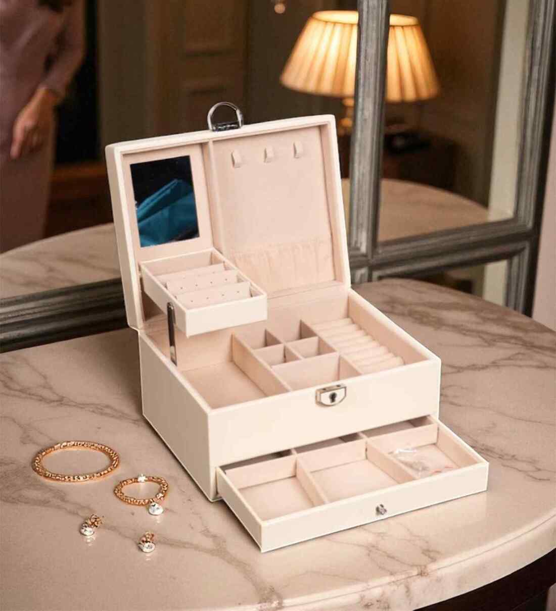 The Aarvi Decor Large Capacity Faux Leather Jewellery Box is the ultimate blend of elegance and utility. Designed with attention to detail, it features a premium faux leather finish, soft velvet interior, and a smart layout to keep your jewellery organized and protected. The in-lid mirror and multiple compartments including hooks, trays, ring rolls, and a lockable drawer make it a complete storage solution. Whether it s your daily-wear studs or special occasion pieces, everything finds a perfect place in this spacious, travel-friendly box.