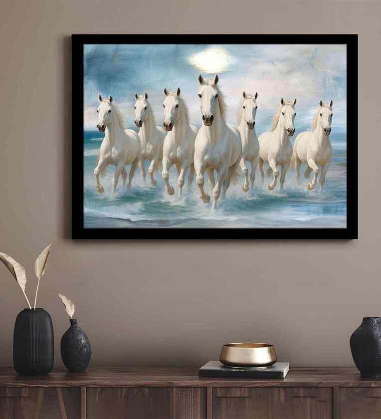 Bring positive energy and elegance to your home with Painting Mantra s Seven White Running Horses Wall Art, designed according to Vastu and Feng Shui principles. This beautiful artwork is printed on MDF wood and framed with a finely engineered wooden frame, measuring 17x23 inches. Perfect for your living room, hallway, or any vastu-friendly space, the seven white horses symbolize strength, speed, and success, helping to attract good luck and prosperity. Easy to hang and maintain, this piece adds both style and positive vibes to your d cor.