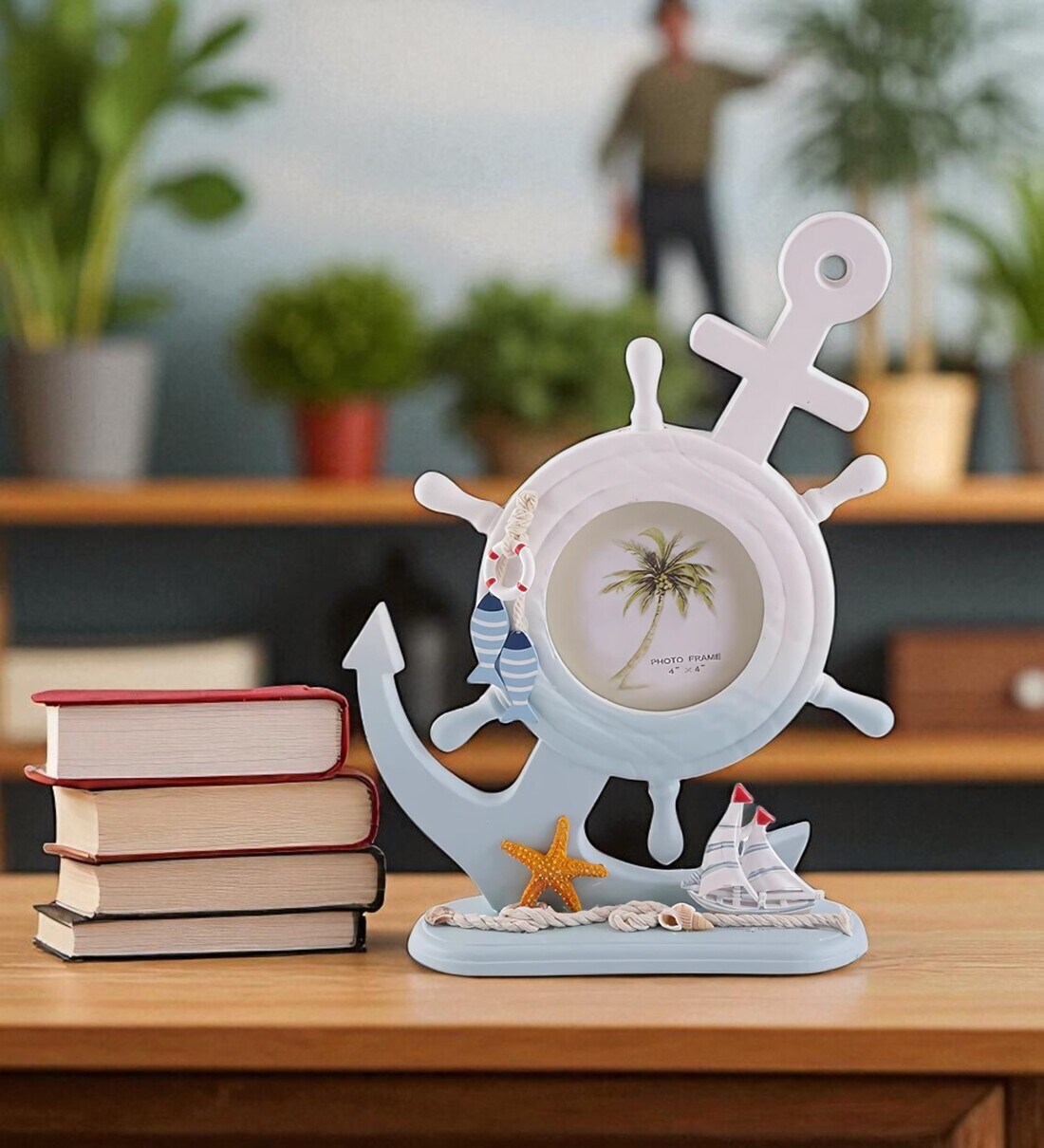 An anchor-shaped ceramic finish wooden photo frame with fish and seaweed embellishments is a charming nautical-themed decor piece. The frame is crafted in the shape of an anchor, symbolizing stability and connection to the sea. Made from smooth, high-quality wood, it often features hand-painted or sculpted details of colorful fish and flowing seaweed, evoking . The central portion holds a photo, framed by the anchor s curves and complemented by the oceanic design elements. This frame is ideal for coastal-inspired interiors or as a keepsake for beach lovers, making it perfect for displaying cherished memories of seaside vacations or marine adventures.