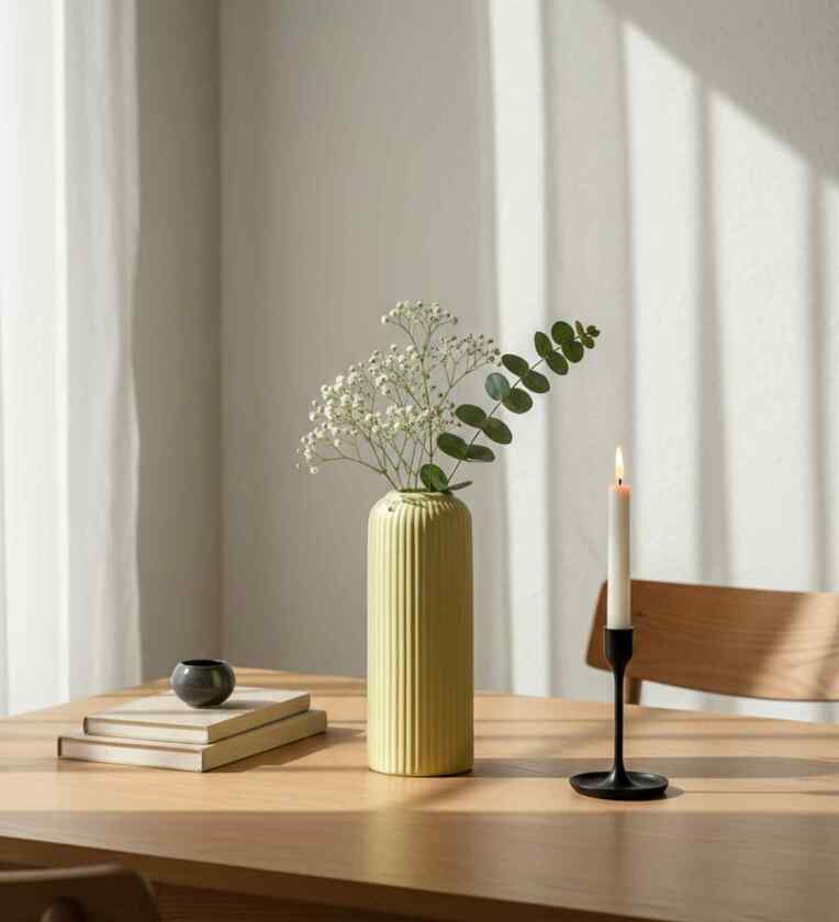 (1Pc) Yellow Ceramic Ribbed Design Matt Finished 10 Inch Table Vase