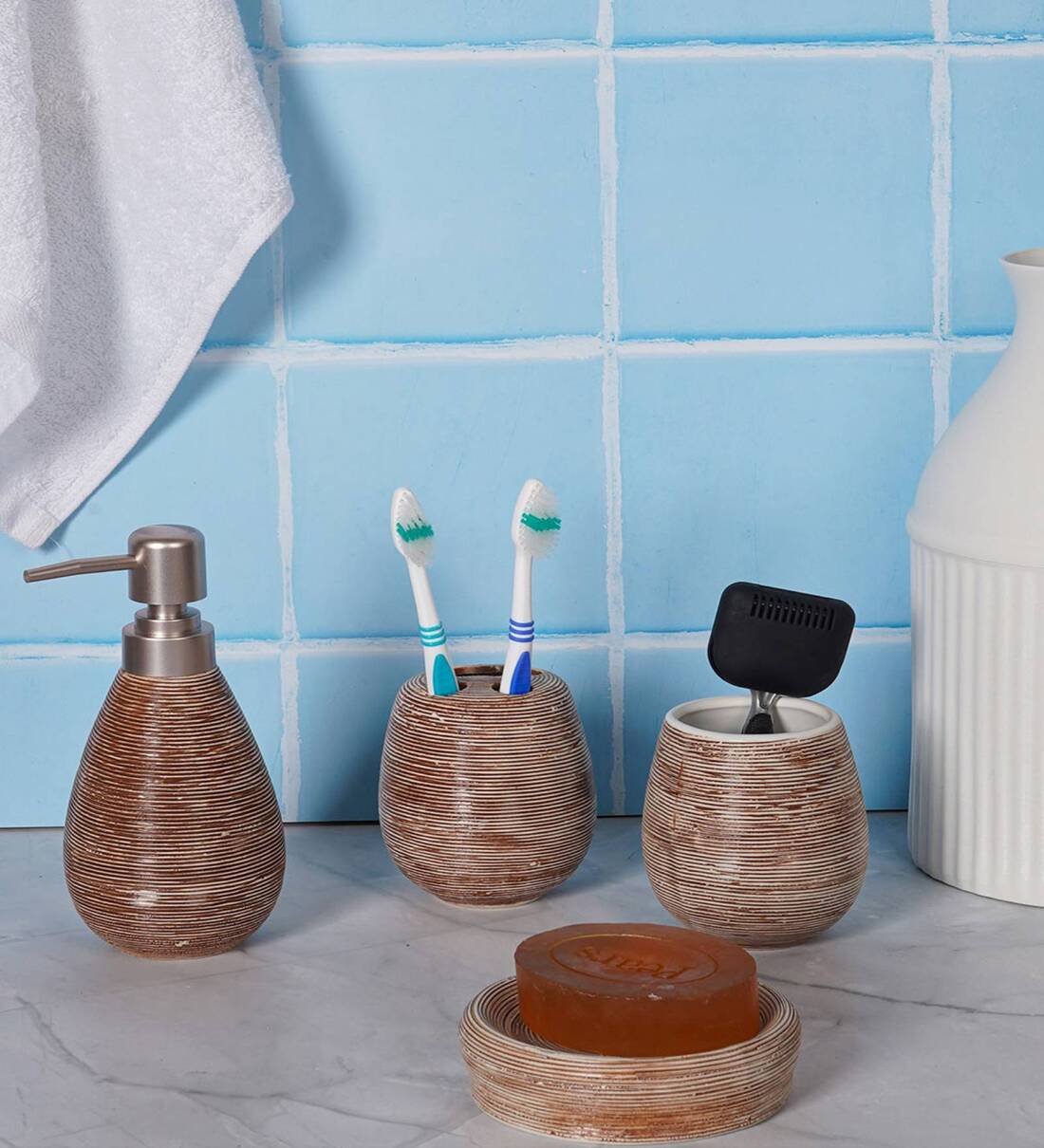 This modern bathroom set adds a touch of elegance and functionality to your bathroom decor. Complete with a soap dispenser, a tray for soap, a holder for toothpaste and brushes, and an additional piece for other essentials, this set is designed to keep your space organized and stylish.