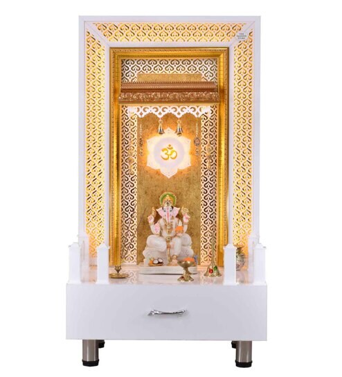 The Mandir Store Wooden Pooja Temple Glossy White With Jali And LED Lights