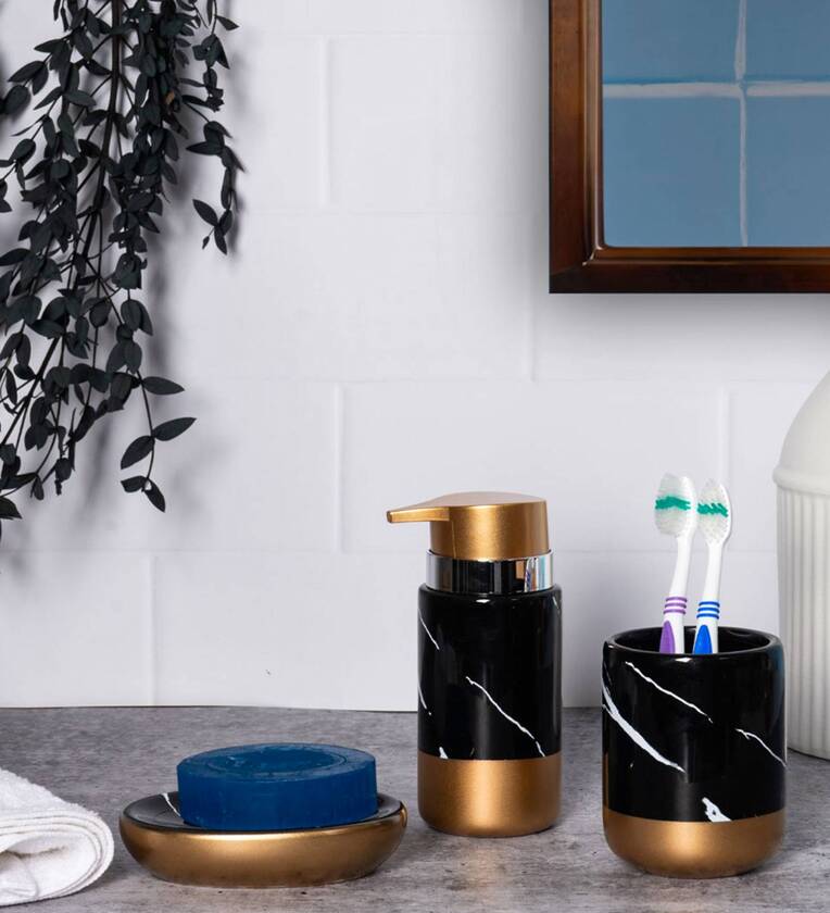 Elevate your bathroom decor with this opulence style bathroom set, designed to add a touch of luxury to your daily routine. The set includes a stylish soap tray, a holder for toothpaste and brushes, and an elegant soap dispenser, making it both functional and decorative. Design: This set features a sophisticated combination of black and gold, exuding elegance and style. The glossy finish enhances the luxurious appearance, while the sleek lines and modern shapes create a cohesive and upscale look that complements various bathroom aesthetics. Functionality: Each piece in this freestanding bathroom set is thoughtfully designed for convenience. The soap tray keeps your soap accessible and organized, the toothbrush holder securely stores toothbrushes and toothpaste. The soap dispenser allows for easy access to liquid soap, ensuring your bathroom remains tidy and stylish. This set not only serves practical purposes but also transforms your bathroom into a chic retreat.