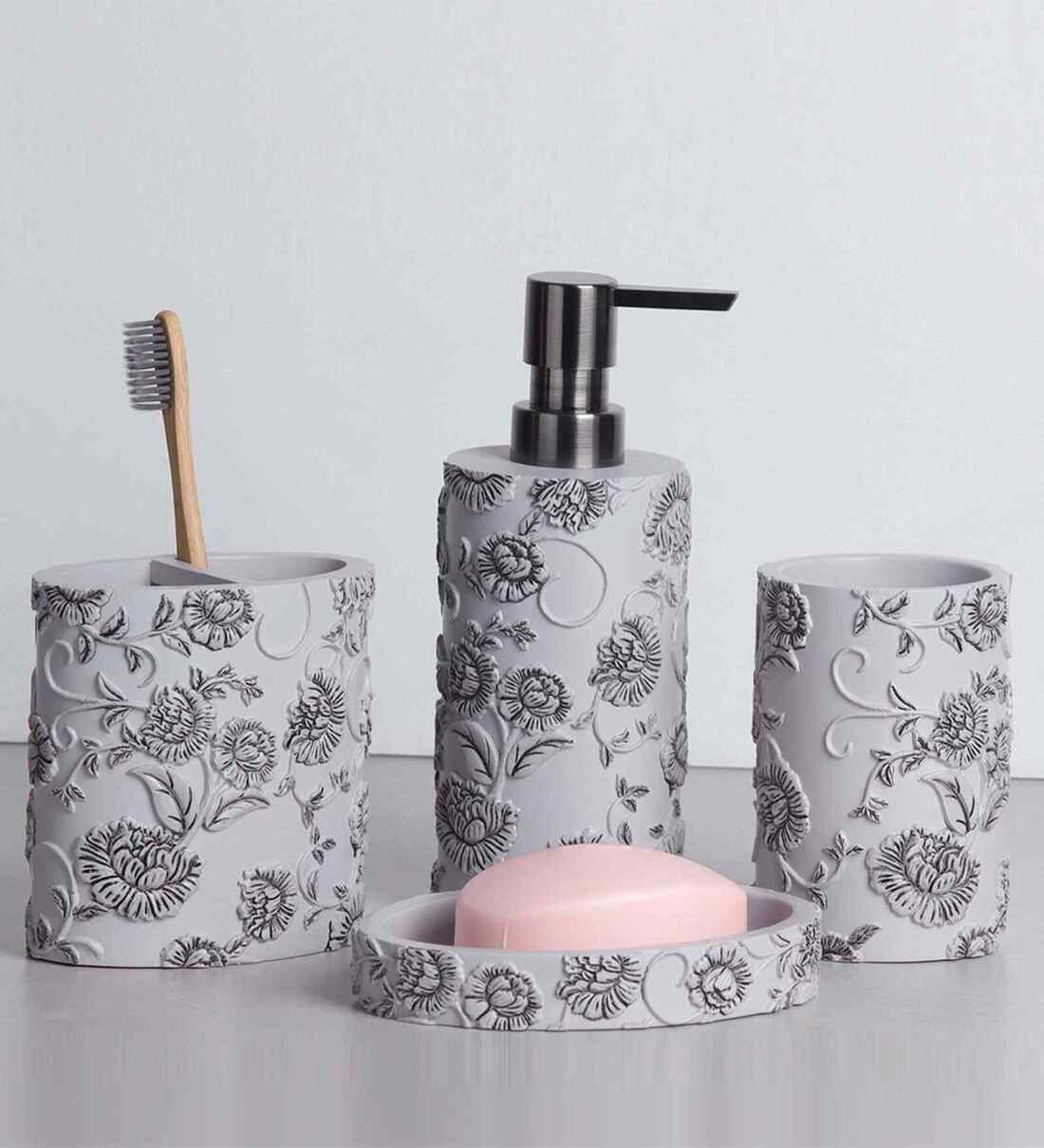 OBSESSIONS presents unique collection of 4 pieces of bathroom sets which is one of the finest quality products and gives your bathroom an attractive look. This would glam up your bathroom space and add new dimension to it. Made from high quality material polyresin, it is durable, sturdy, and great for everyday use.DISCLAIMER: Props featured in the product images are for design illustration purposes and are not included with your order.