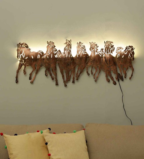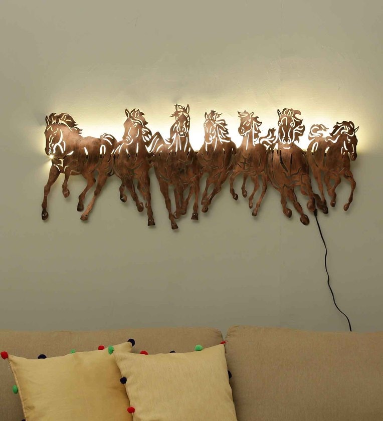 Copper Finish Iron 7 Running Horse With LED Metal Wall Art