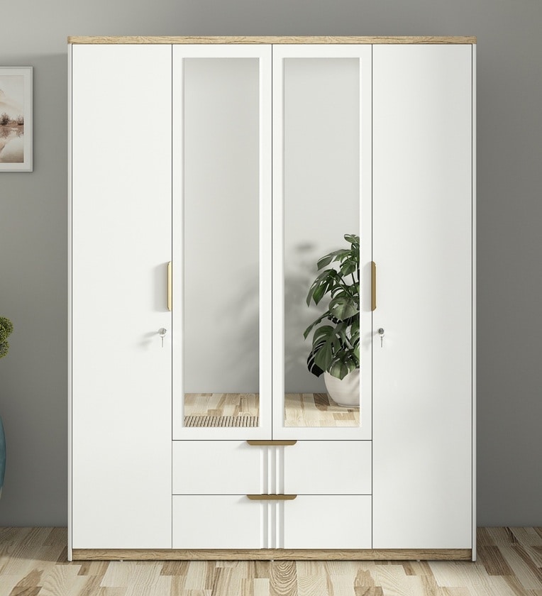 Transform your bedroom with the spacious and stylish Casacraft from Pepperfry's Abran 4-Door Wardrobe. Designed in a sleek high-gloss white PVC-foiled finish, this wardrobe combines luxury with practical features including two full-length mirrors, a hidden internal locker, and two spacious external drawers to keep your belongings well-organized.