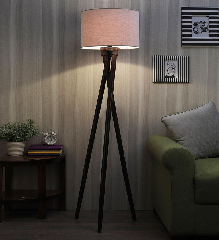 Adriana Beige Fabric Shade Tripod Floor Lamp With Wood Base
