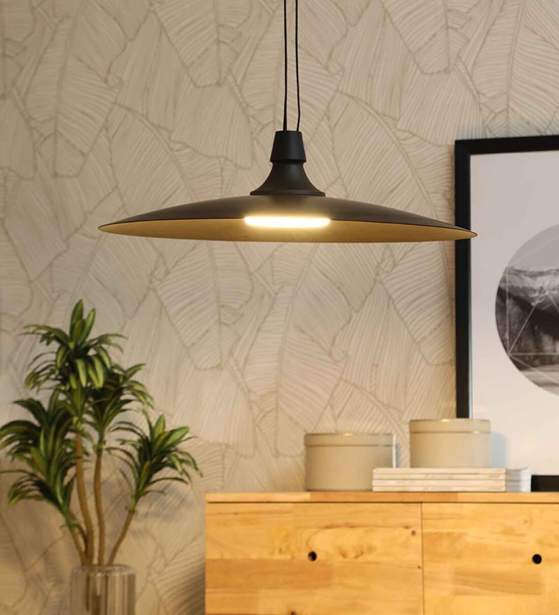 Sleek black pendant light structure in Mexican hat style applied in pendant solution form with remote controllability