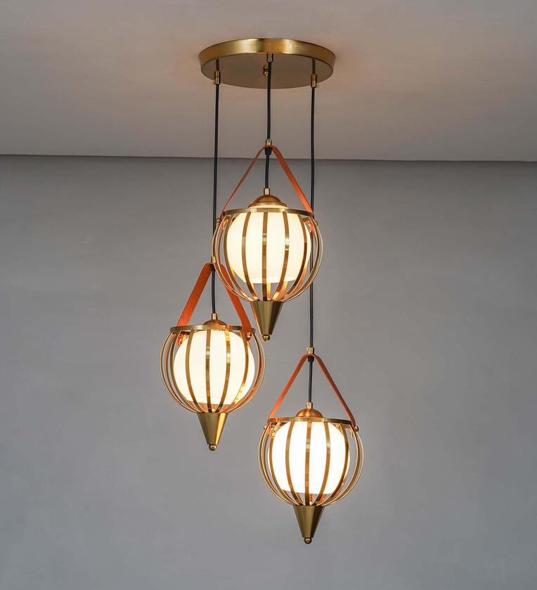 Elevate your interiors with the sophisticated ALFIE 3-Light Ceiling Pendant, a perfect blend of modern elegance and timeless charm. Crafted from high-quality brass-finish metal and accented with rich brown leather detailing, this pendant light adds a warm and stylish touch to any space.