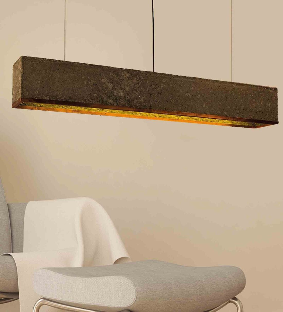 Weathered imperfections rendered to perfection in a hanging Amalgam Oblang lamp, handcrafted from feather cement with a copper finish rim, to lend a discerning glow to living and hospitality spaces.
