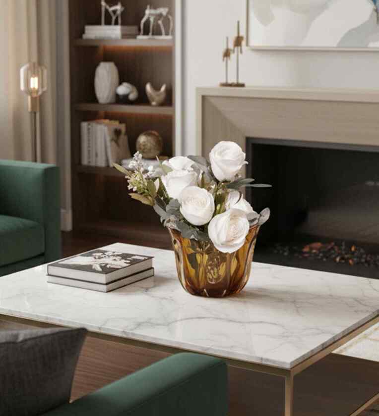 This is a beautifully crafted glass vase with a rich amber hue. The vase has a delicate, organic shape with ruffled edges that are slightly transparent or frosted. The flowing design features smooth, curved lines running through the body, giving it an elegant, natural feel, reminiscent of a flower or a soft wave. The deep amber color contrasts with the clear edges, enhancing its intricate, artistic details. It appears to be a hand-blown piece, showcasing craftsmanship with its fluid, sculptural form. This vase would make a striking statement as a decorative centerpiece or floral display.