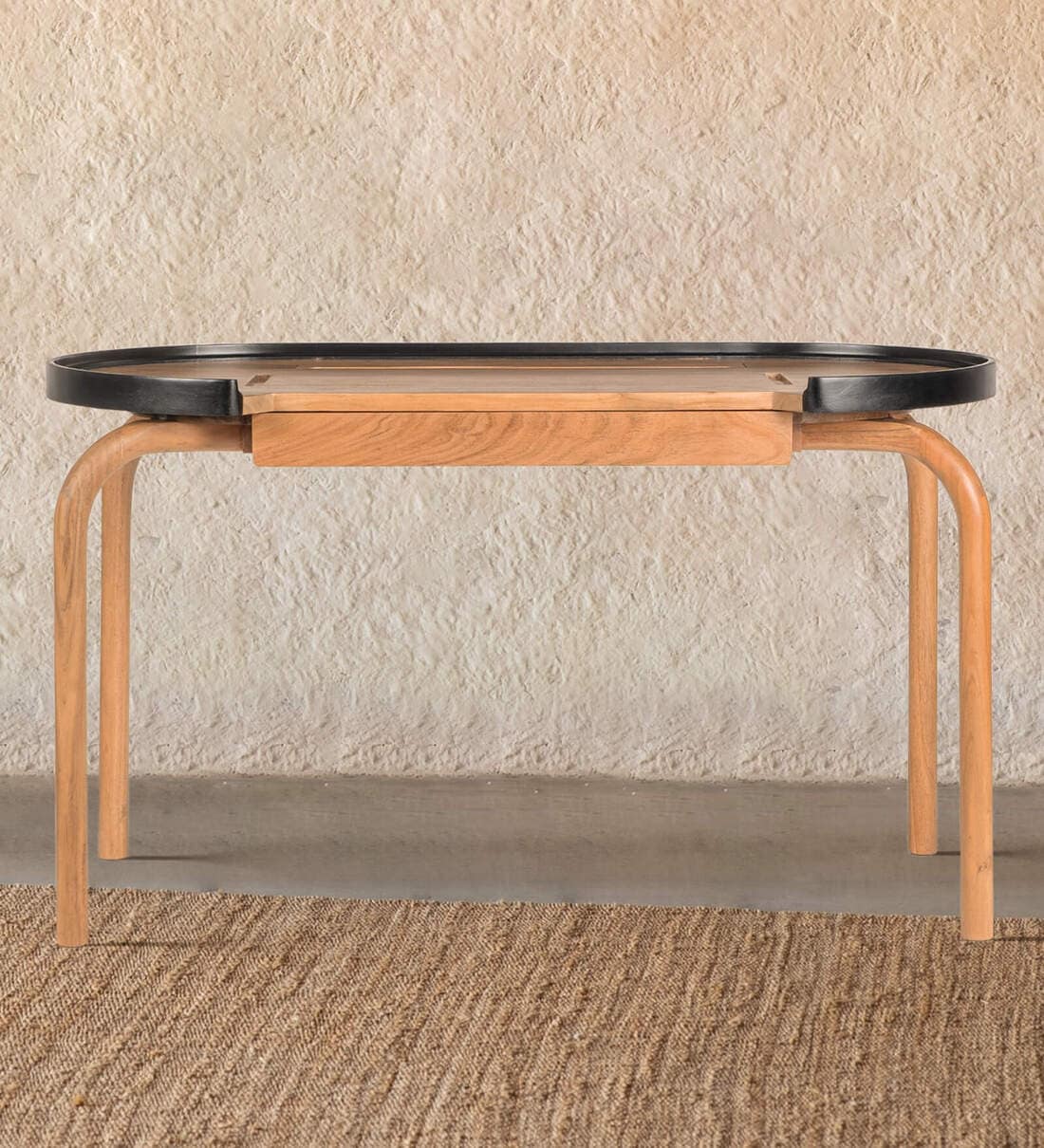Explore the Andaman Wooden Study Table, meticulously crafted from warm-toned acacia wood. Its elongated oval tabletop, adorned with a visible grain, is bordered with a borer-free black wood. Supported by four elegantly curved legs, slightly splayed for stability and style, this modern wooden study table features a seamlessly integrated drawer, maintaining sleek lines and functionality. Redefine your workspace with the flawless fusion of warmth and modern design embodied in the Andaman Study Table. "Depending on your screen settings and resolution on your device there may be a slight variance in fabric color and wood polish of the image and actual product. Wood grains will vary from product to product in case of solid wood furniture."