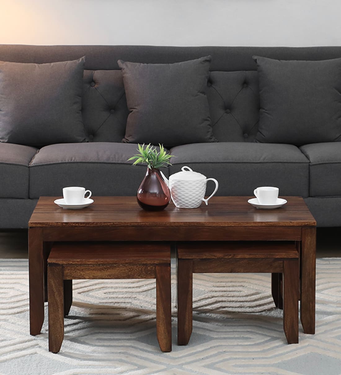 Anitz Sheesham Wood Nesting Coffee Table Set in Scratch Resistant Provincial Teak Finish With Stools