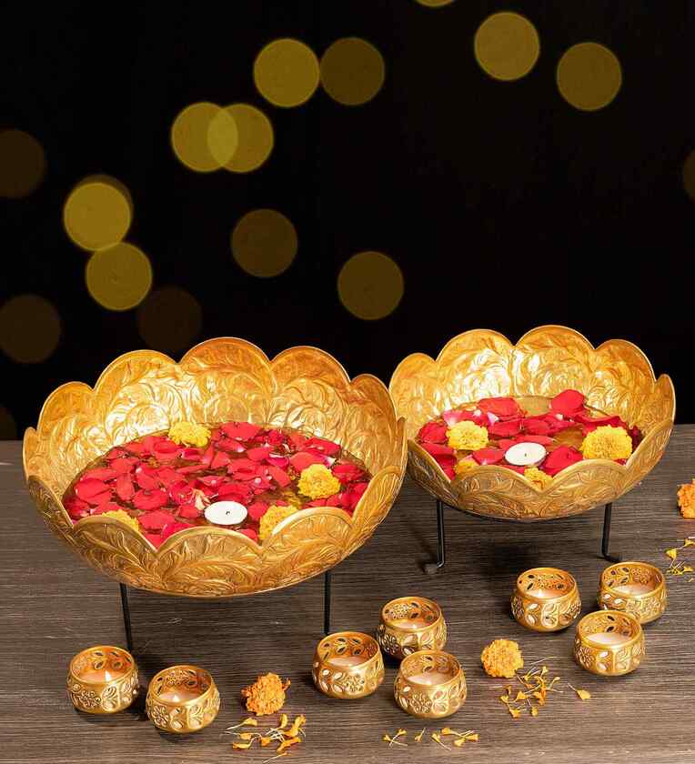 Flower Embossed Urli Set of 8 pcs in Aluminium With Brass Gold Platting is a beautifully Crafted bowl for floating flowers, It's a Contemporary Designed Metal Urli Bowl to decorate your Pooja Room. Decorative Urli for pooja mandir for decor. This Indian handicraft home decor was designed to be used as wedding decorations, centerpieces, or even to place floating candle arrangements in your entryway. Package Contains a set of 8 pieces Urli & Votives. All of the individual products might not be identical to each other because they were made by hand so all are unique pcs in terms of quality and finish Care - Normal Wipe Cleaning. No use of acidic content. Package Contains a set of 8 pieces Urli & Votives. All of the individual products might not be identical to each other because they were made by hand so all are unique pcs in terms of quality and finish Care - Normal Wipe Cleaning. No use of acidic content.
