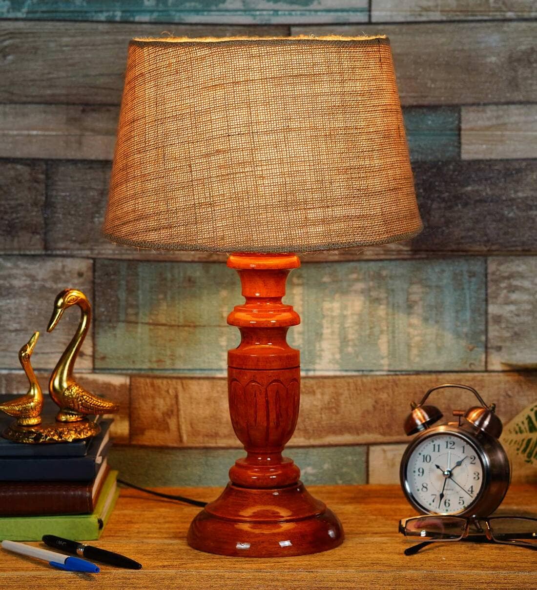 Antique Brown Natural Fiber Shade Night Lamp With Wood Base