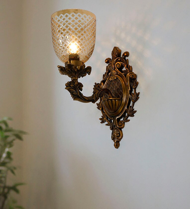 Antique Cast Aluminium Traditional Uplight Wall Sconce with Golden Luster Glass