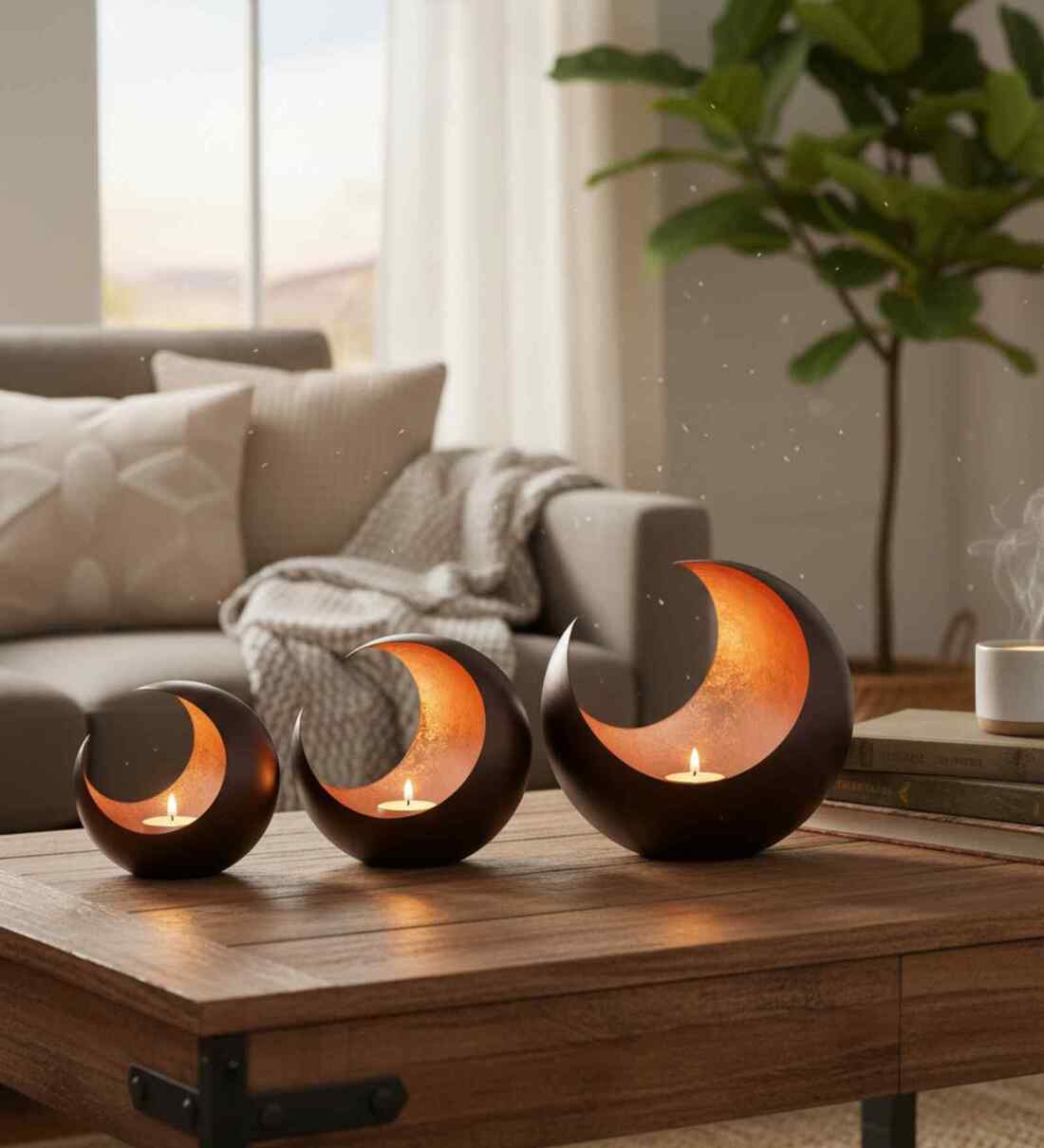 KREATIVE ART S Enjoy Decorating Your Table With Our Crescent Moon Table Candle Holder Set Of 3. These Candle Holders Will Make Any Venue More Mood-Enhancing. I Think You Should Buy This Set For The Upcoming Holidays, Like Christmas Or Halloween. Because It Looks Very Good. These Bedside Table Decor Ascents With Unique Colors Bring The Spirit Of The Season To Your Home, Adding A Simple Yet Elegant Touch To Your Decor. Designed With Simple Elegance, These Moon Candle Holders(Set Of 3 Pieces) Are Certain To Bring Light To Any Event Or Occasion You Host. The High-Quality Metal Is Intricate Indian Handicrafts Made By Our Skilled Artisans In India. Features No Of Pcs :- Set Of 3 Different Sizes Size:-S- 6"/M-9"/L-12" Material - Mild Steel Colour:- Gold Leafing Handmade Iron Collectible Metalware Tip: After Those Votive Candles Burn Out, Remove The Empty T Light Containers And Buy Only Tea Light Candle To Replace Inside! Care:- Don T Use Harsh Chemicals To Clean Just Use Soft Cotton Cloth To Maintain.